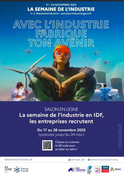 - le salon digital du 17 au 28 novembre 2025 (possibilité de postuler jusqu'au 24 novembre selon l'affiche ci-contre), les entreprises recrutent leurs futurs salariés dans tous les domaines de l'industrie.